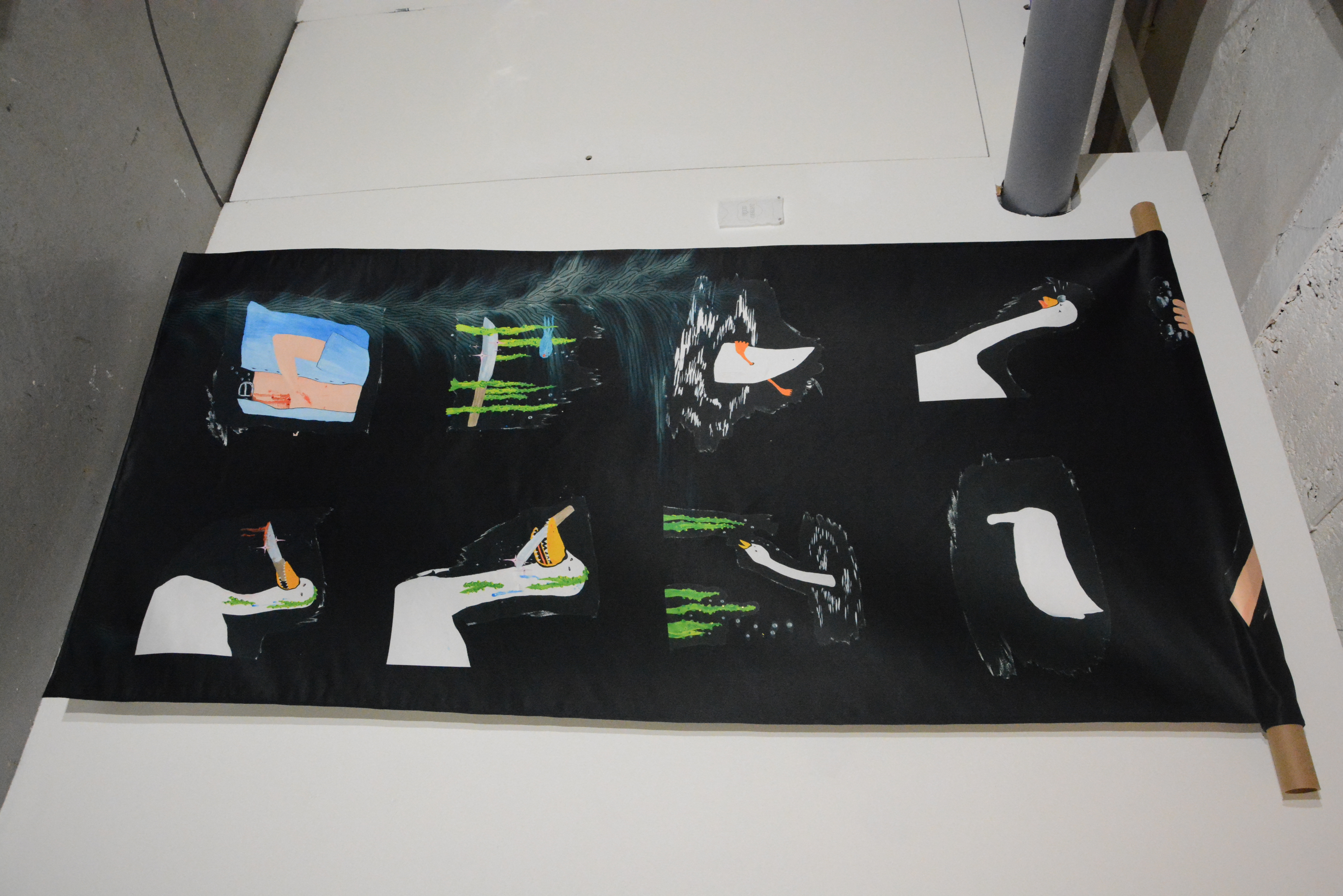 'Can you repeat that?' is an exhibition curated by artist run platform SYNKOP in collaboration with Detroit Gallery. The exhibition aims to highlight the characteristics of the fabric roll, and artists working with textile print. All artists have all been given the same format to work around.The Artists are selected for their range in expressions and represent textile print currently happening in Sweden. Through their range of approaches we hope the viewer can get a deeper understanding of the range of textile.